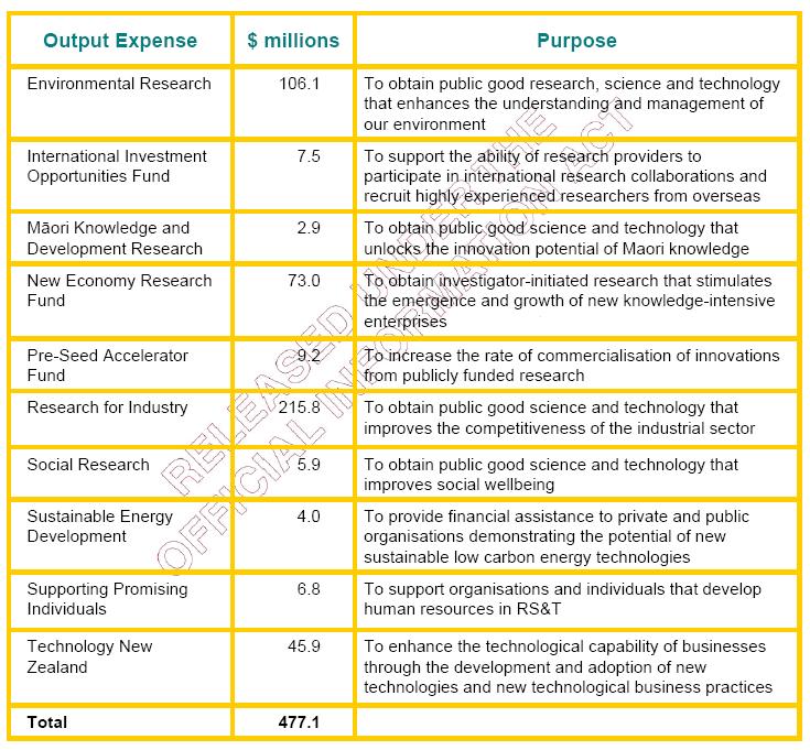 The briefing paper put together for the minister by the Foundation for Research, Science and Technology also gives a good overview of where science funding in New Zealand goes.