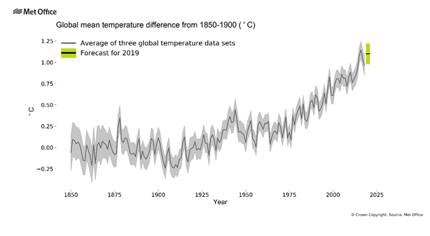“The Met Office forecasts the global average temperature for 2019 to be between 0.98°C and 1.22°C, with a central estimate of 1.10°C, above the pre-industrial average period from 1850–1900. Since 1850, 2016 is the warmest year on record with a central estimate of 1.15°C above the same baseline.”