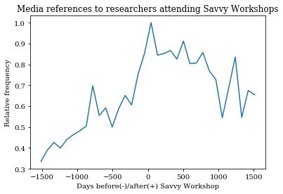 In contrast, Science Media Savvy workshops seem to result in sustained media appearances that persist over a number of years. Figure 2 shows a similar cross-correlation for scientists and researchers who attended a full Savvy workshop. Interestingly, media appearances for these researchers seem to be increasing before the Savvy course: this may reflect the career profile of researchers who take the course, which tends to be skewed towards early career researchers, or it could be that increasing contact with the media motivates researchers to take the course. Either way, researchers experience an immediate and relatively sustained increase in their media presence following the course.