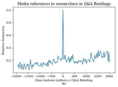 | Figure 1: Temporal cross-correlations between interactions the researchers have with the SMC and their appearance in the media: (a) for Expert Reactions (left) or (b) for Q&A Briefings (right). The time difference is measured in number of days. |