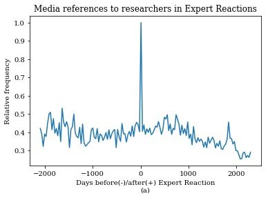 We began by looking at the time-based cross-correlation between interactions the researchers have with the SMC and their appearance in the media. This reveals the distribution of time intervals between an SMC interaction and an appearance in the media for the researchers in our data set. The cross-correlations, which are illustrated in the figures below (Figure 1), show that when scientists are quoted in a Q&A or Expert Reaction online article, their mainstream media presence over that month is significantly increased. This boost is not sustained however – an appearance in an Expert Reaction or Q&A does not significantly increase a researchers presence in the media beyond a month. The frequency of appearances both before and after the SMC interaction is about the same.
