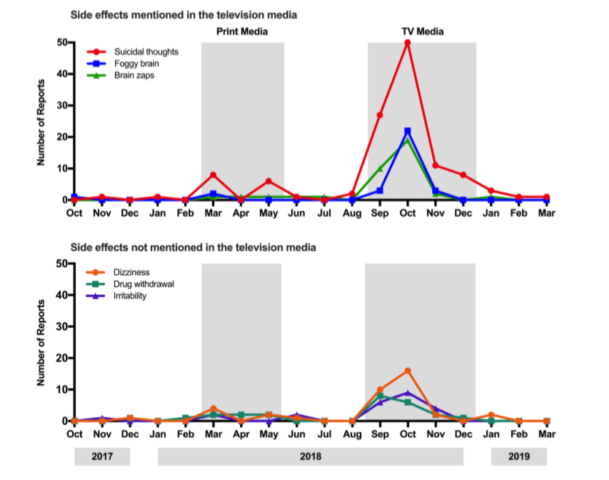 “The other thing that discounts the idea that the drug was causing the problems is the specific symptoms that were mentioned in the bulletins, compared to symptoms that weren’t mentioned in the bulletins. We looked at that and found the symptoms mentioned in the bulletins tended to be the ones that were reported afterwards. There were some that were only mentioned in the bulletins – one particular one called ‘brain zaps’ wasn’t mentioned before, and only appeared in the [symptom] reports after the TV report.”