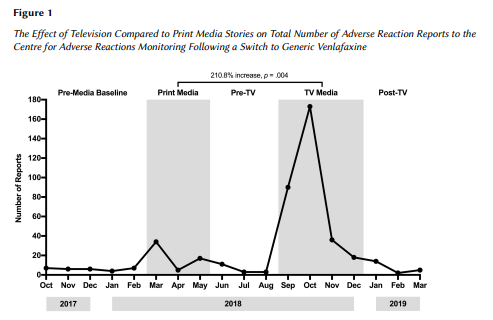 “Overall we found that television stories increased side effect reporting by around 200% more than the print articles. The more public health-relevant fact was the increase in specific symptoms, in particular suicidal thoughts. When those were mentioned [in the media], they went from a very low base rate to a rapid increase. That’s more of a public health worry, that people believing they were going to get stronger suicidal thoughts on this new medication. That mainly came from the conversations with patients that were shown on the television reports.
