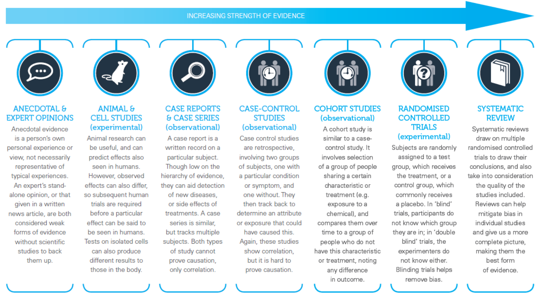 Being able to evaluate the evidence behind a claim is important, but scientific evidence comes in a variety of forms. Here, the different types of scientific evidence are ranked and described, particularly those relevant to health and medicinal claims.